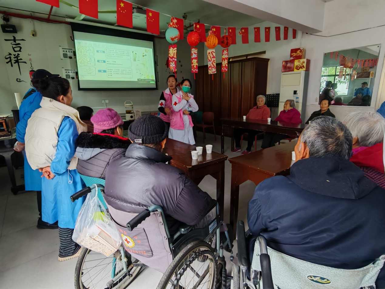 活动中,医务志愿者们秉持专业、细致的服务理念,为院内老人开展免费健康筛查,逐一进行血压、血糖检测,详细记录健康数据,针对老人的身体状况个性化解答健康咨询,提供科学的饮食、用药及生活方式指导,并为老人们送上精心调配的中草药茶饮,助力老年群体日常养生调理。结合养老院照护工作实际需求,志愿者团队还开展了系列专业技能培训与健康科普宣讲:现场讲解并演示海姆立克急救法的核心操作要点、应急处置流程及注意事项,让养老院护理人员快速掌握实用急救技能;围绕“脾胃病功能性消化不良”主题开展专题科普,系统讲解老年脾胃疾病的发病特点、诊疗要点及日常养护知识,普及针对性的饮食调理与康复建议;同时开展床边护理实操培训,从老年患者基础护理、并发症预防、舒适化照护等方面,为护理人员进行规范化操作指导,切实提升院内护理人员的专业照护能力。