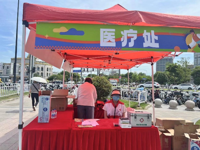 为防止出现中暑,红十字志愿者们在现场提供藿香正气水、饮用水、急救箱等物资,及时为参赛者和观众递上一杯清凉的水,提供贴心的服务,得到了大家的一致好评。