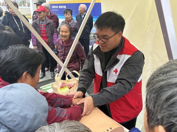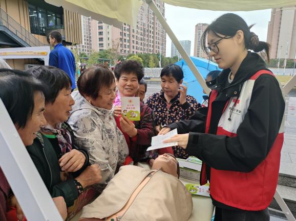 柘林镇红十字会在现场设立“急救4分钟”摊位。志愿者们不仅向居民发放急救知识手册,更通过“手把手”教学,指导心肺复苏按压等急救技能。居民们认真聆听讲解、积极参与实操练习,现场学习氛围浓厚。