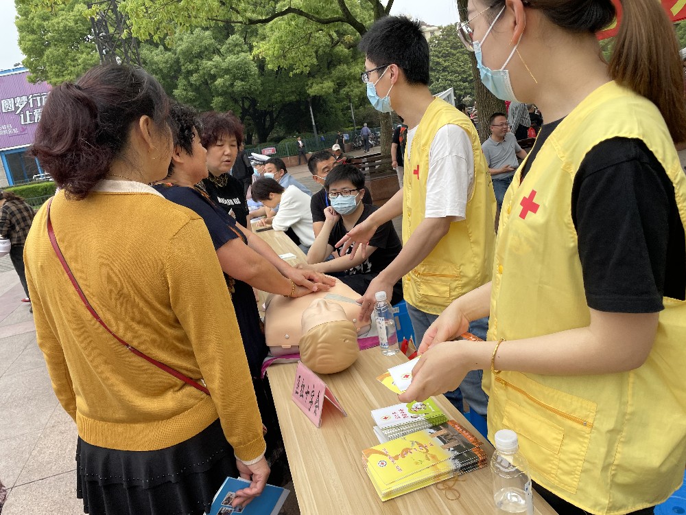 5月12日,区红十字会志愿者积极参与在文化广场开展的集中宣传活动。现场为过往群众讲解心肺复苏和自动体外除颤仪(AED)的操作方法,并发放红十字相关宣传手册。