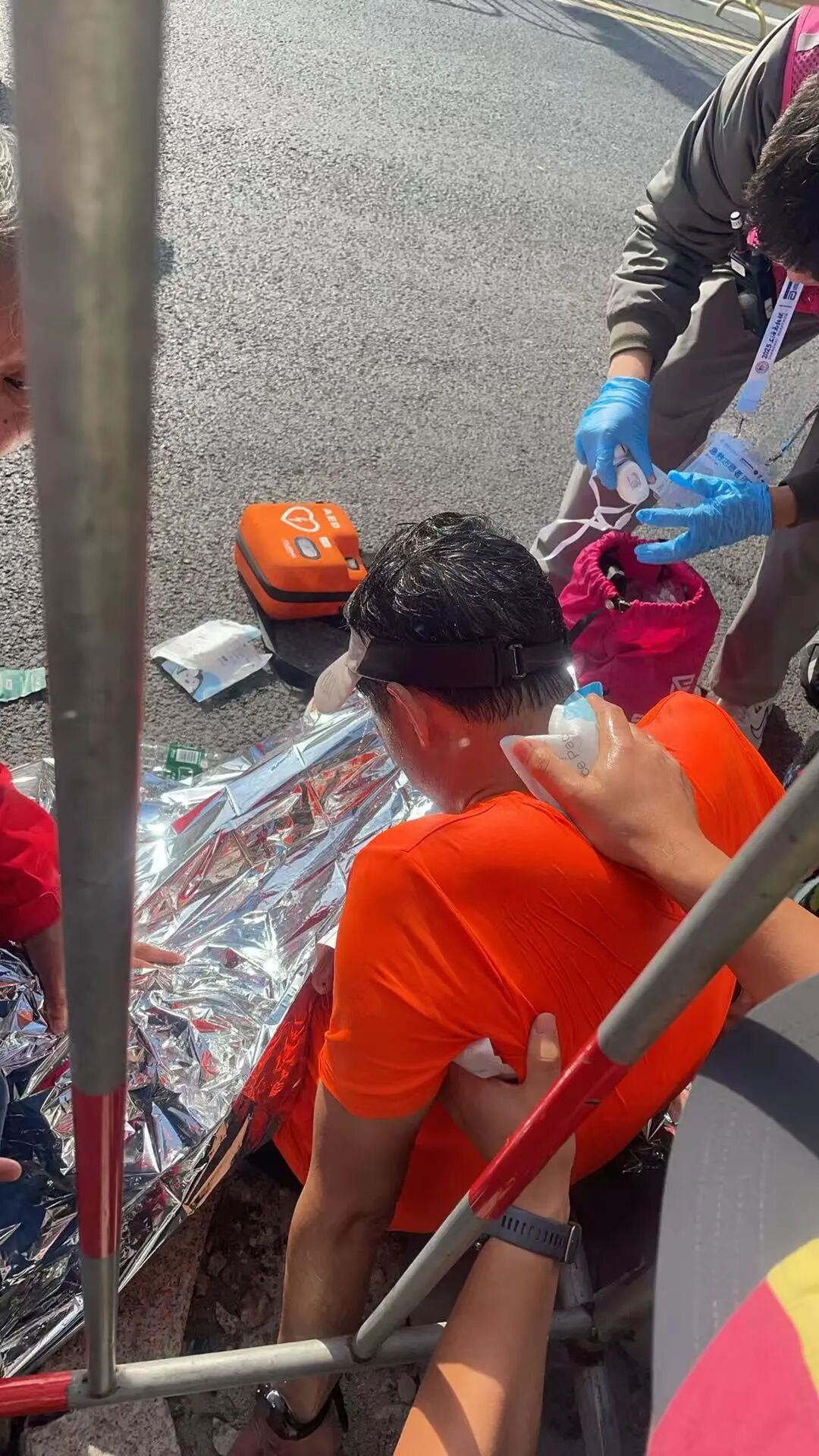 尽管该跑者意识模糊,出现了无意识的攻击行为,两次击打小先并扯坏其帽子,但小先始终坚守救援岗位,持续开展降温操作。随后,120救护车及医护人员抵达现场,众人合力将跑者抬上担架,目送其被紧急送医。