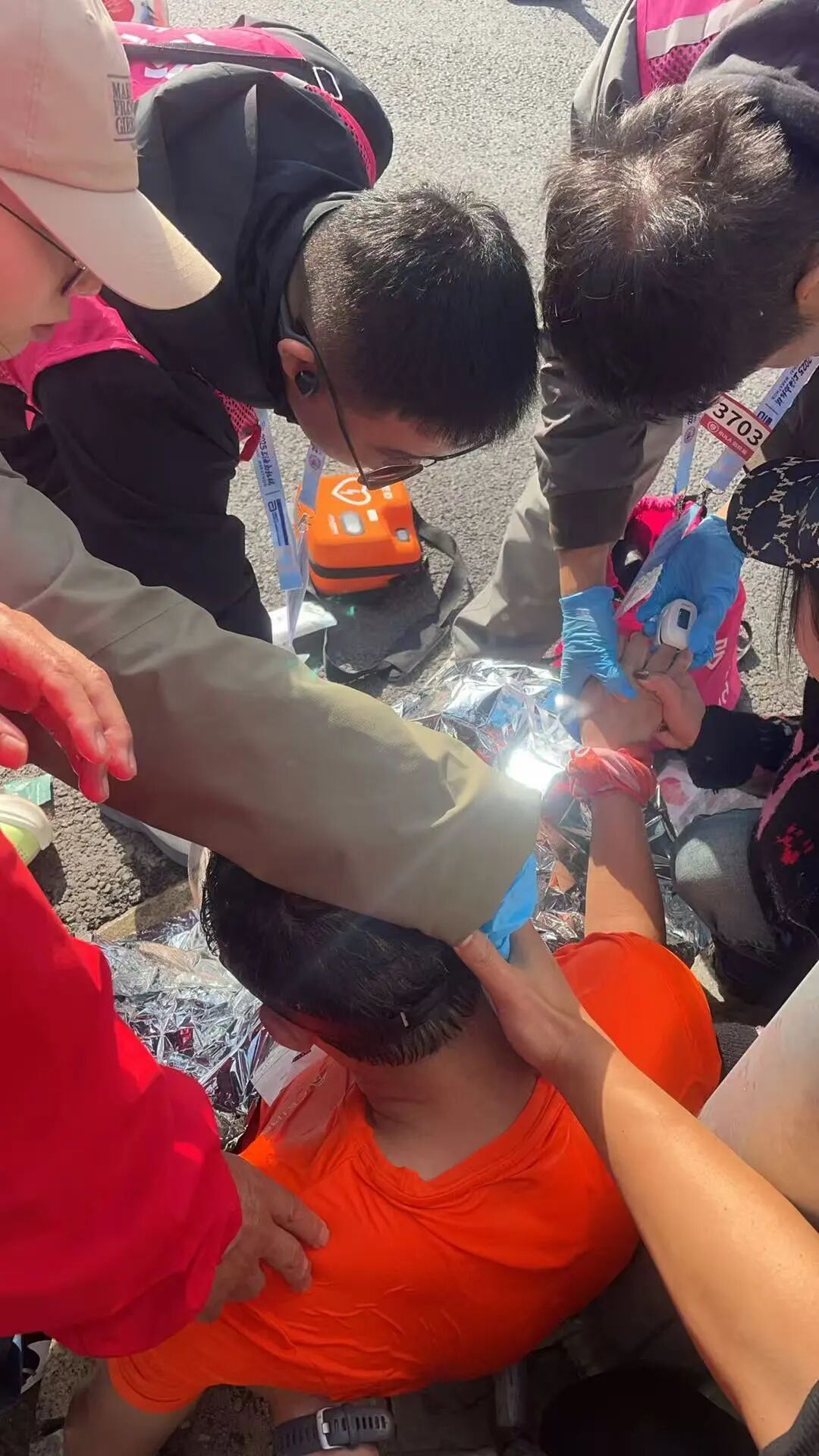 发布时间:2025-12-0411月30日,2025上海马拉松在晴空万里中鸣枪开跑,在37.2公里处的小象悦跑团啦啦队补给站,一场紧急救助于赛事期间温情上演。小象悦跑啦啦队队员小先回忆,当时一名参赛跑者突然在补给站旁坐下,摄影师两次呼叫该跑者均未得到回应,他与队友娜娜第一时间察觉异常。 发现情况后,小先与娜娜一边紧急呼叫附近的急救志愿者,一边寻找水源为跑者降温。急救志愿者迅速赶到现场,测量显示跑者体温已达39.8℃且持续上升,血压暂时无法测出,情况十分危急。救援过程中,小先与娜娜始终未停止辅助急救,运用在江苑社区红十字急救培训中学到的知识,用冰袋和凉水持续为跑者颈动脉、腋下、大腿内侧等部位降温,其他小象悦跑团队友则全力协助寻找降温物资。