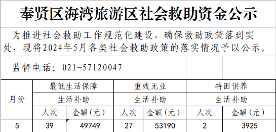 奉贤区海湾旅游区社会救助资金公示(5月)