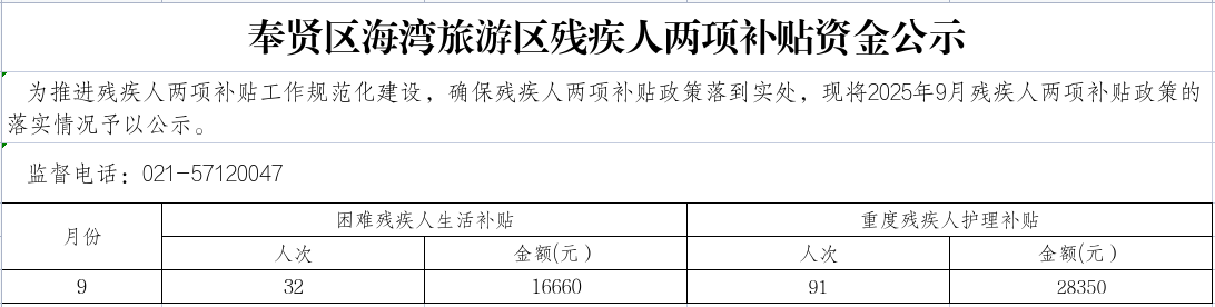 奉贤区海湾旅游区残疾人两项补贴资金公示(9月)