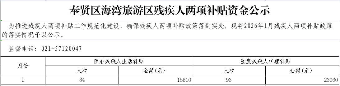奉贤区海湾旅游区残疾人两项补贴资金公示(1月)