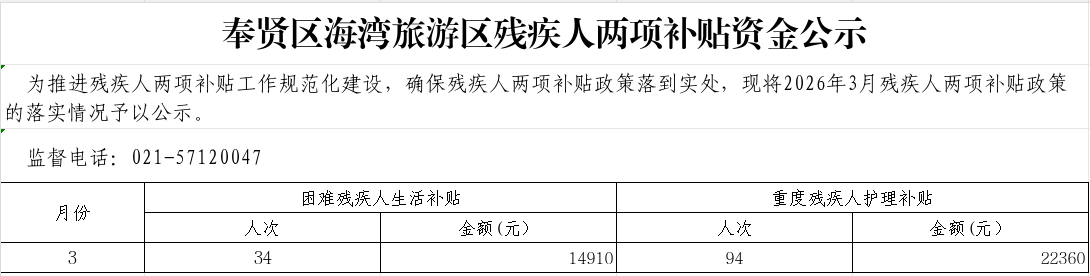 奉贤区海湾旅游区残疾人两项补贴资金公示(3月)