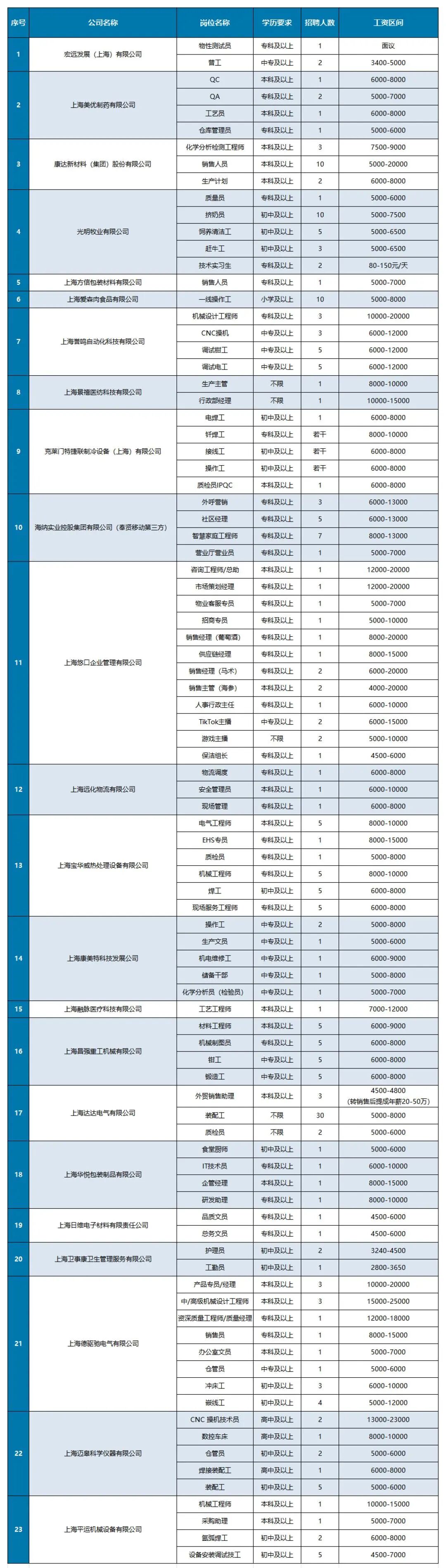 工程师、销售、办公室文员、采购助理、操作工、电焊工、护理员、质检员、营业厅营业员、食堂厨师、储备干部等岗位。