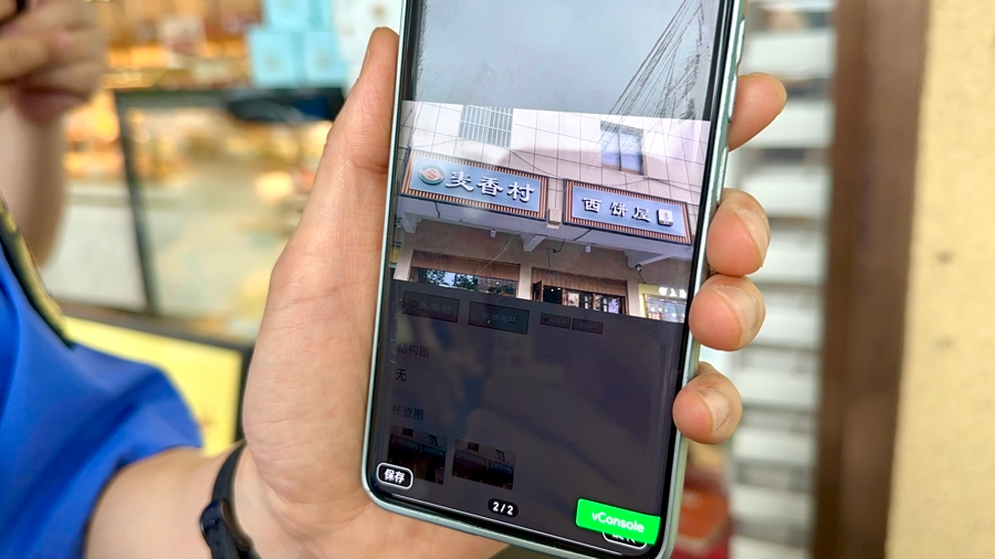在西渡街道的沪杭公路上,麦香村面包店外贴上了这块专为沿街商铺设计、携带有商铺二维码的智慧门牌。手机扫码之后,就可以看到开店指引、外摆申报、食安公示、店招指引等多个栏目,点击之后便可进入菜单得到分门别类的指引。