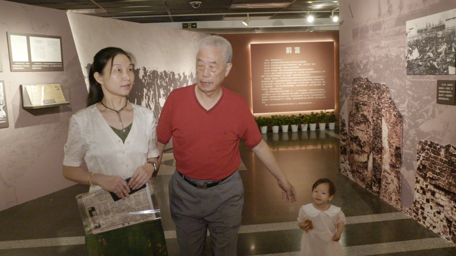 上图馆员还特别引导老人一家参观了正在展出的《起来!起来!起来!——纪念中国人民抗日战争暨世界反法西斯战争胜利80周年专题展》。