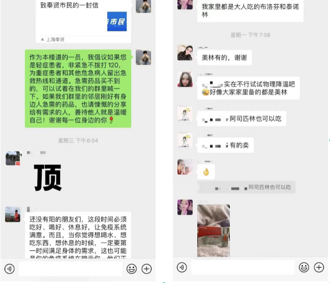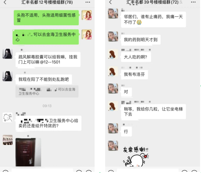 黄双双是恒贤居委的一名计生干部,这几天她都挨个询问孕产妇的情况,并嘱咐她们有什么需求可以随时与她联系,如有明显的不适症状居委可以帮助联系或送医。其中4位已经“阳”的孕产妇均向她求助,想备两粒“泰诺林”。黄双双及时将这几位的孕产妇信息汇总,并对接了街道卫生服务中心,社区医生将对这几位特殊的孕妈妈给予更多的关怀和健康指导。当得知“泰诺林”药品目前紧缺,黄双双便想到了前两天刚发过急需药品邻里分享的倡议。果真,2号楼的群里有一位年轻的女士晒出过自己可分享的药品,这可让几位烦恼的孕妈妈有了定心丸。