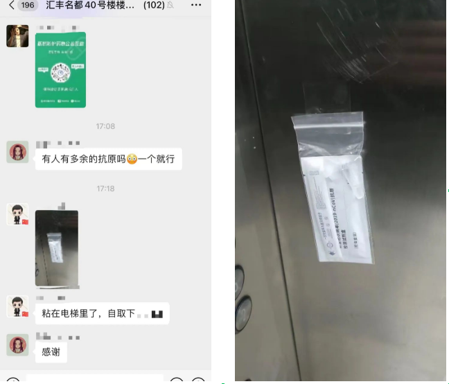 “有人有多余的抗原吗?一个就行!”这是发在汇丰名都40号楼居民群里的求助信息。“粘在电梯里了,自取一下!”刚刚10分钟,就有邻居马上行动,把抗原送给了有需要的人。