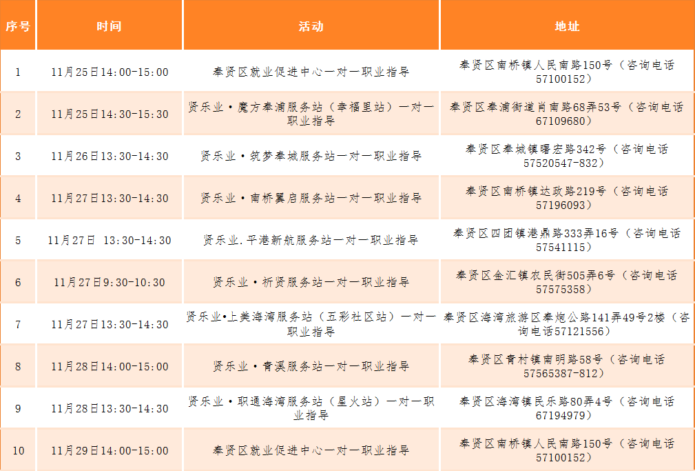 奉贤区“15分钟就业服务圈”11月25日-11月29日站点活动安排