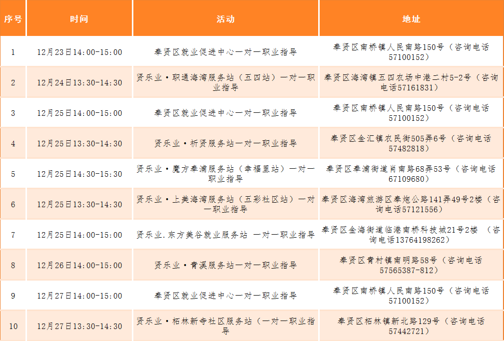 奉贤区“15分钟就业服务圈”12月23日-12月27日站点活动安排请查收