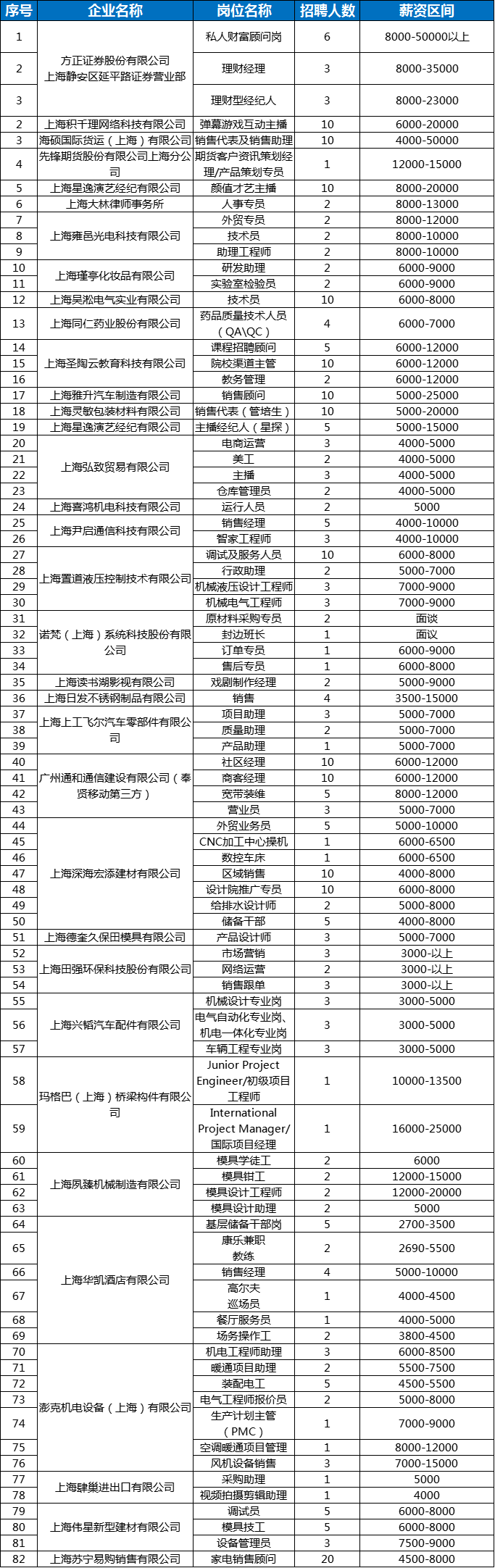 本次活动总计有172家企业报名参加,招聘岗位包括电商运营、美工、主播、仓库管理员、销售经理、智家工程师、机械电气工程师、采购专员、售后专员、戏剧制作经理、项目助理、外贸业务员、产品设计师、市场营销、模具设计工程师、空调暖通项目管理等503个,招聘人数3634人。