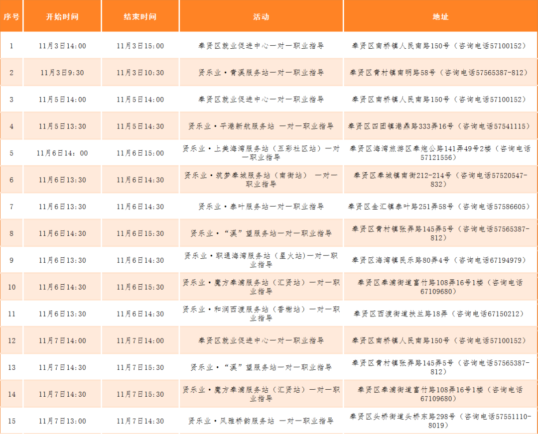 奉贤区“15分钟就业服务圈”11月3日~11月7日站点活动安排