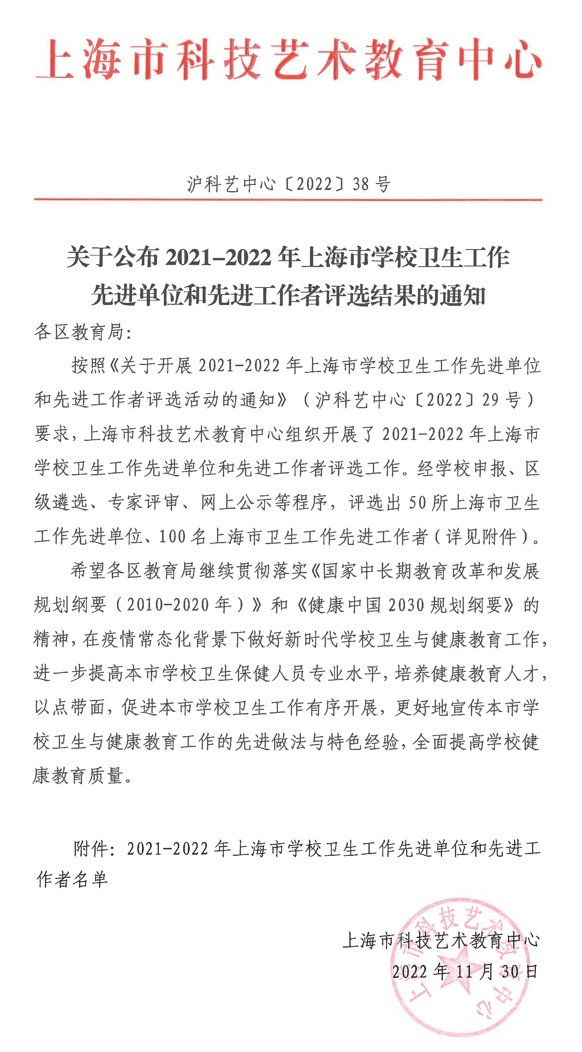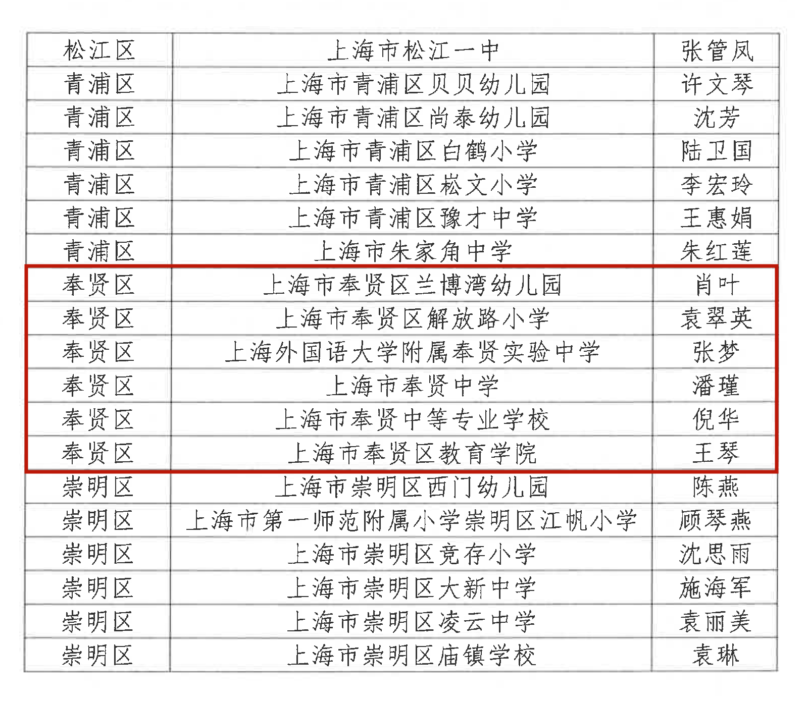 上海市科技艺术教育中心组织开展2021-2022年上海市学校卫生工作先进单位和先进工作者评选工作。经学校申报、区级遴选、专家评审、网上公示等,评选出50所上海市卫生工作先进单位,我区解放路幼儿园、阳光外国语学校、汇贤中学3所学校榜上有名。评选出100名上海市卫生工作先进工作者,我区兰博湾幼儿园肖叶、解放路小学袁翠英、上外附属奉贤实验中学张梦、奉贤中学潘瑾、奉贤中等专业学校倪华、奉贤区教育学院王琴等6位老师榜上有名。