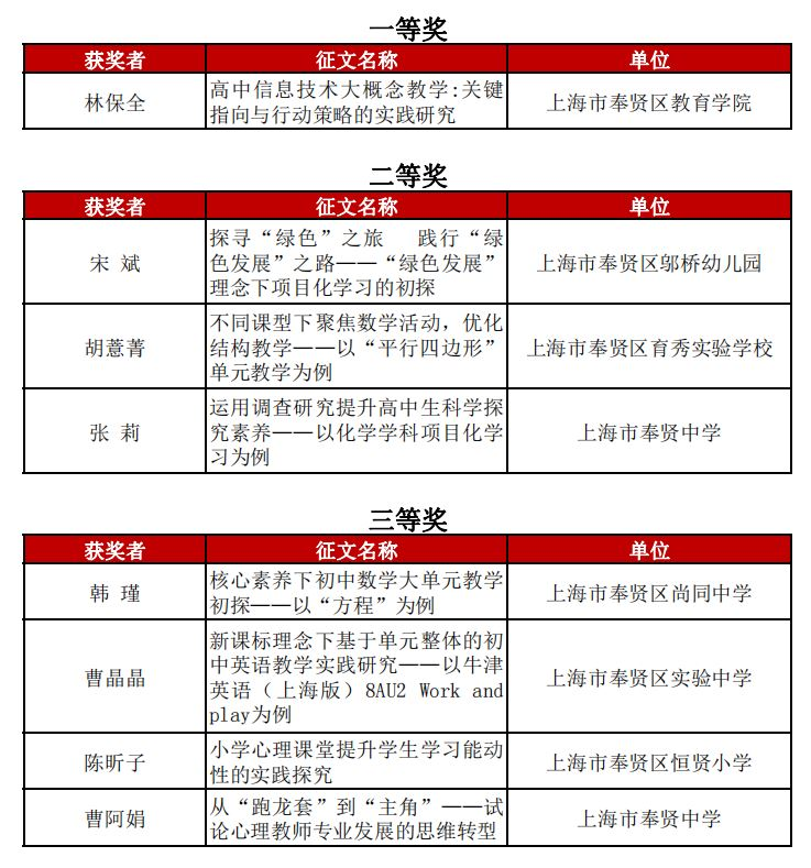 为展现新课标改革以来的新探索、新举措、新成果,今年4月至10月,上海市教师教育学院(上海市教育委员会教学研究室)举办“践行新课程理念的教师行动”征文主题活动。近日,有关获奖名单公布,奉贤区教师荣获1个一等奖、3个二等奖、4个三等奖,奉贤区教育学院荣获优秀组织奖。