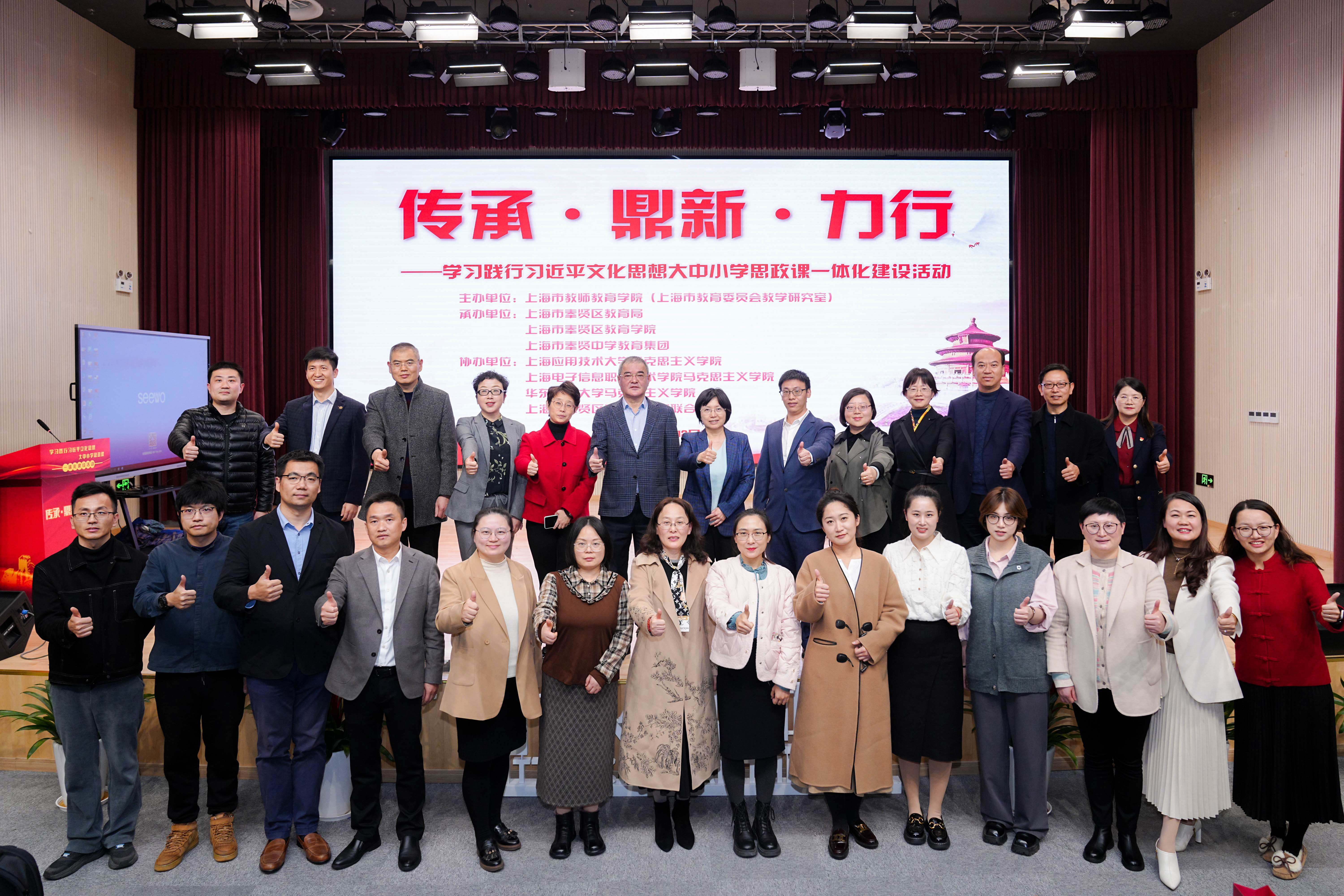 为深入学习贯彻习近平总书记关于思政课建设的重要讲话精神,推动习近平文化思想融入大中小学思政课,做到进教材、进课堂、进头脑,落实好立德树人的根本任务,近日,由上海市教师教育学院(上海市教育员会教学研究室)主办,奉贤区教育局、奉贤区教育学院、奉贤中学教育集团承办,上海应用技术大学马克思主义学院、上海电子信息职业技术学院马克思主义学院、华东理工大学马克思主义学院、上海市实验·崇实联合中学、奉贤区徐铭浩、胡大维、张世杨名教师工作室协办的“传承·鼎新·力行——学习践行习近平文化思想大中小学思政课一体化建设活动”顺利举行。
