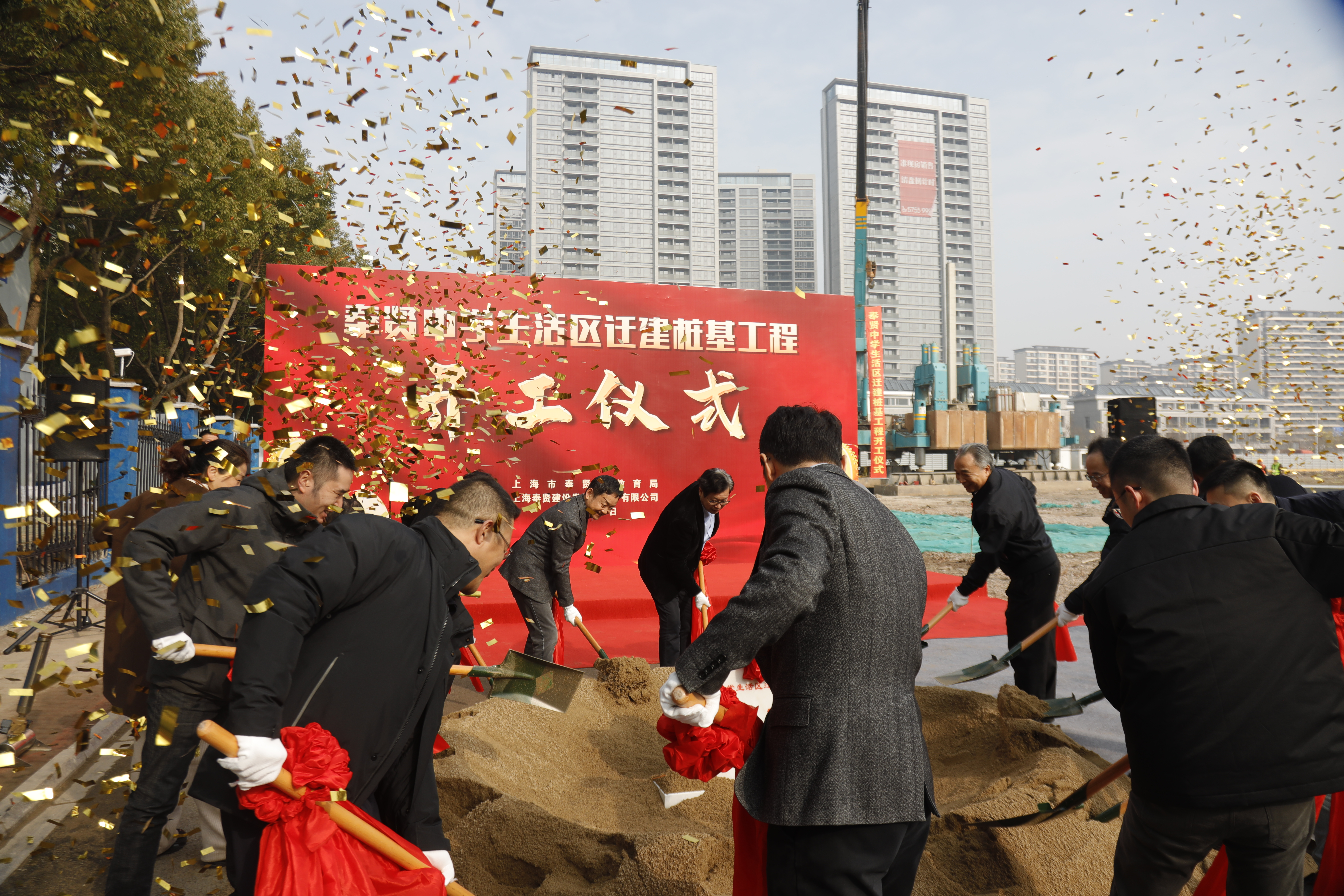 陶立宣布奉贤中学生活区迁建工程正式开工。到场领导共同为新建项目奠基培土。