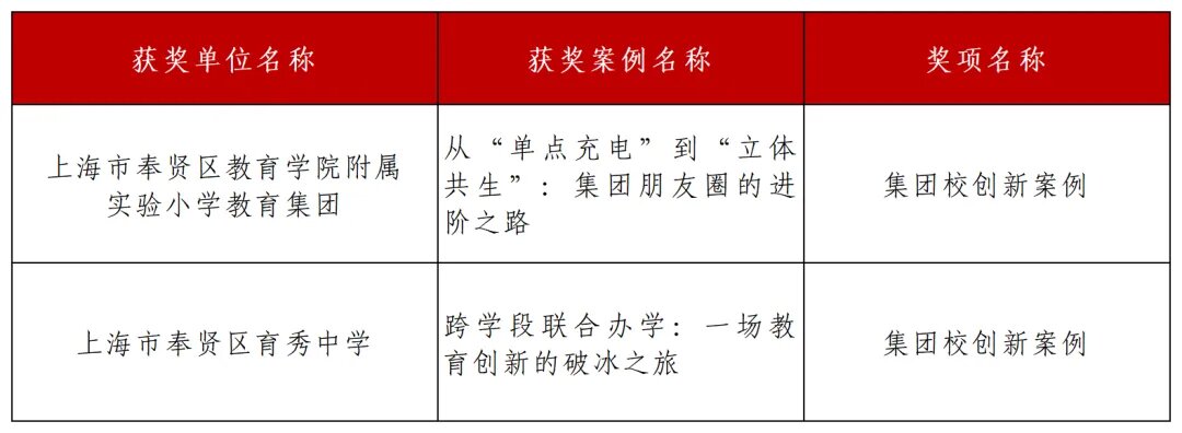 发布时间:2025-09-19“2025区域教育及集团化办学创新案例”已于今年9月正式发布。本次案例推荐活动由中国教育报与中国教育发展战略学会区域教育专委会联合主办。据悉,此次活动共征集到来自全国28个省份、300多所集团校提交的700余个推荐案例。经过专家团队多轮严格遴选,最终评选出50个区域教育创新案例和50个集团化办学创新案例。奉贤区两所教育集团校“榜上有名”,所推荐的案例入选“集团校创新案例”,分别是奉贤区教育学院附属实验小学教育集团推荐案例《从“单点充电”到“立体共生”:集团朋友圈的进阶之路》,以及育秀中学推荐案例《跨学段联合办学:一场教育创新的破冰之旅》。