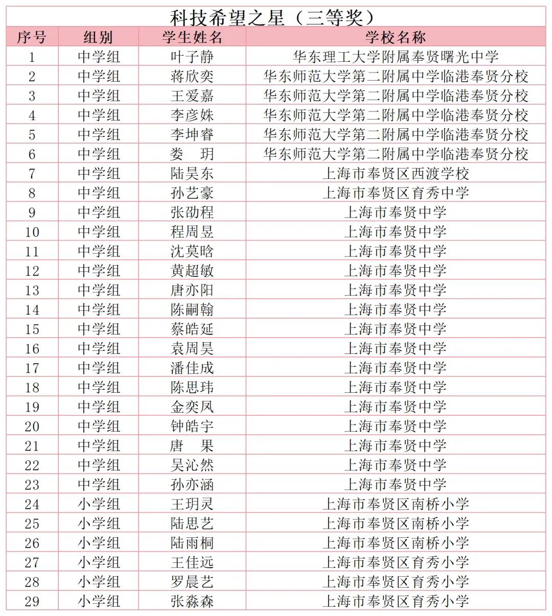 近日,第二十三届上海市百万青少年争创明日科技之星活动落幕。奉贤区共有35所中小学校申报了各类研究项目,荣获“明日科技之星”(一等奖)6人,“明日科技之星提名奖”(二等奖)13人,“科技希望之星”(三等奖) 29人,各等第获奖数量均有所提升。
