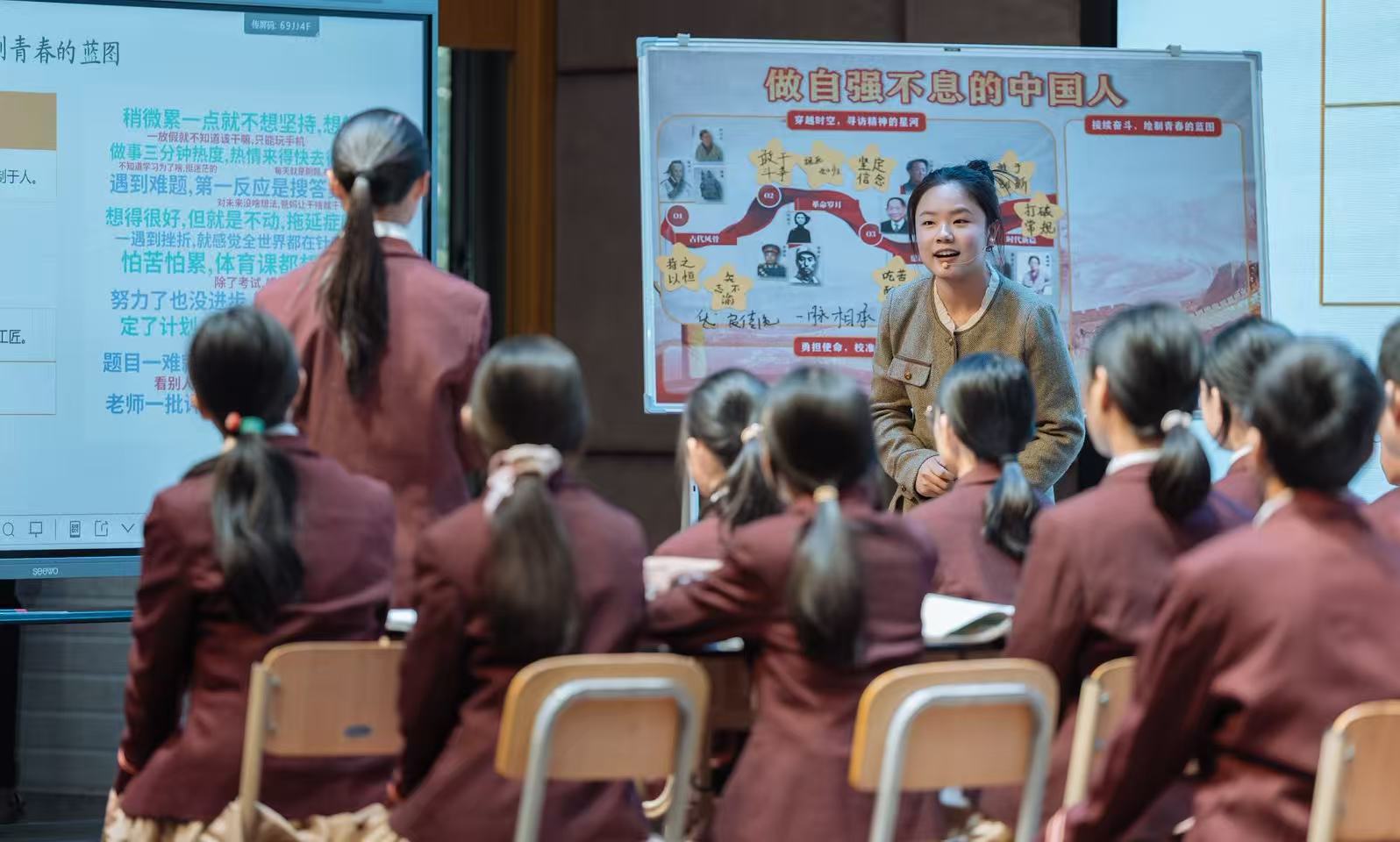 王乐钰老师执教的七年级第二单元《做自强不息的中国人》,以参与学校主题宣传展板策划为学习情境,通过“榜样人物时间轴的分析”等学科任务,培养学生分析和解决问题的能力。