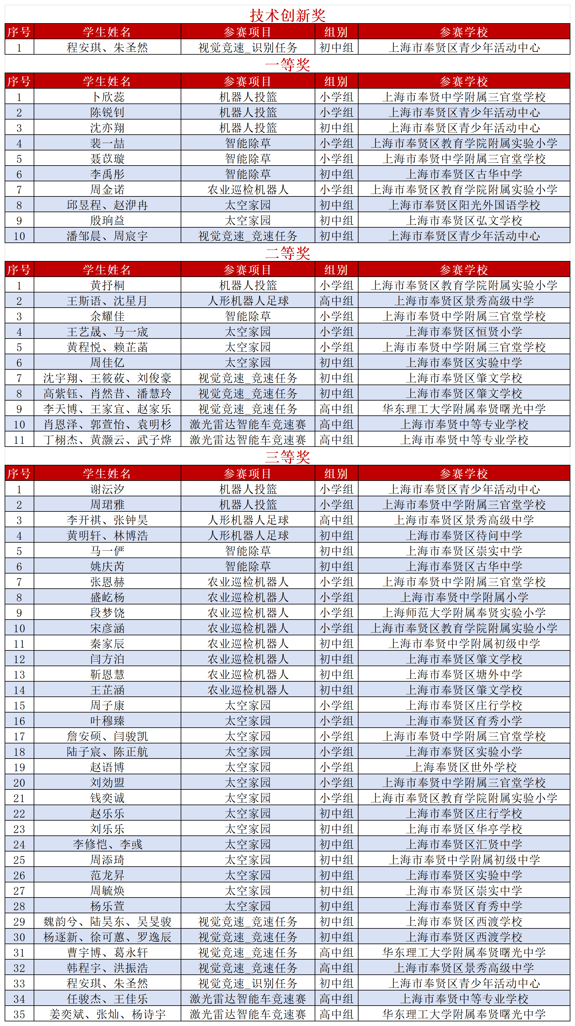 奉贤区遴选出区赛优秀选手,共组织30所学校104名中小学生,组成66支参赛队,参加全部八大赛项的角逐。最终,奉贤学子荣获技术创新奖1项,一等奖10项、二等奖11项、三等奖35项,参赛获奖率近85%。