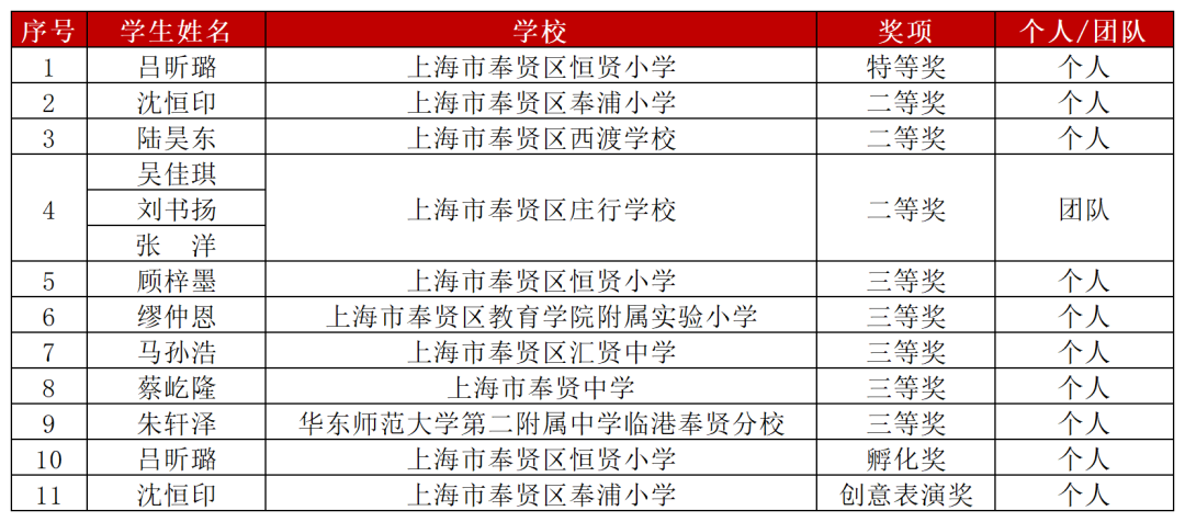 奉贤区通过区级选拔,共推荐90个项目参与市级角逐。经市级初评、复评、终评,奉贤区共斩获11个奖项,包括特等奖1项、二等奖3项、三等奖5项、以及孵化奖1项和创意表演奖1项。此外,区青少年活动中心获评优秀组织奖,恒贤小学、奉浦小学获评优秀组织学校奖,区青少年活动中心洪卫老师获评优秀指导老师奖。