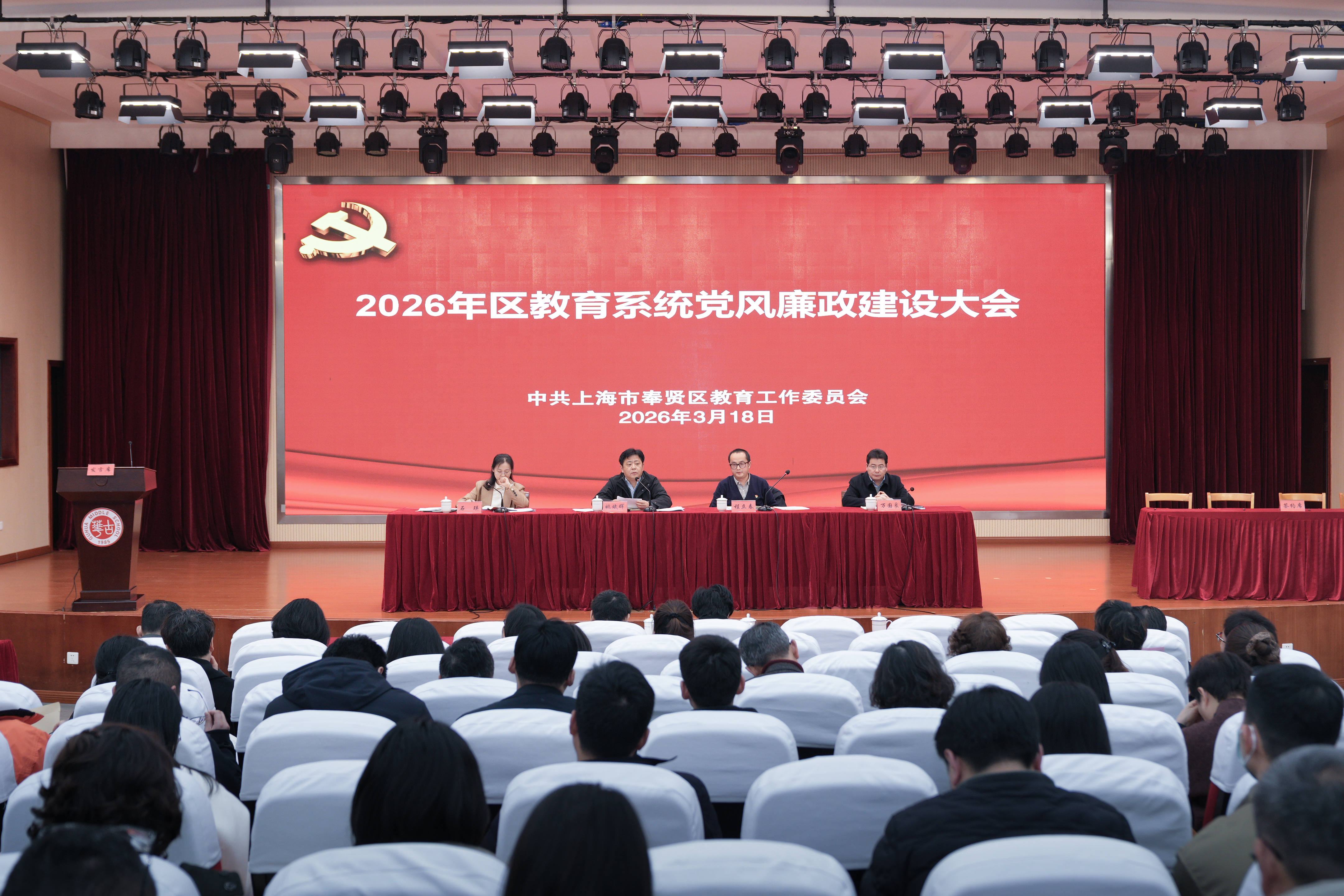 3月18日,2026年区教育系统党风廉政建设大会在古华教育会堂举行。区教育工作党委书记姚斌晖,区教育工作党委副书记、区教育局局长程立春讲话,区教育工作党委副书记、区教育工会主席石瑛通报上年度教育系统廉政风险防控自查情况和各基层单位《“四责协同”记实手册》检查情况,并作本年度党风廉政建设工作部署,区教育工作党委委员、区教育局副局长万国良传达中央、市、区纪委全会和2026年教育系统全面从严治党工作视频会议精神。区二级巡视员、教育局总督学,区教育局党政班子成员出席会议。