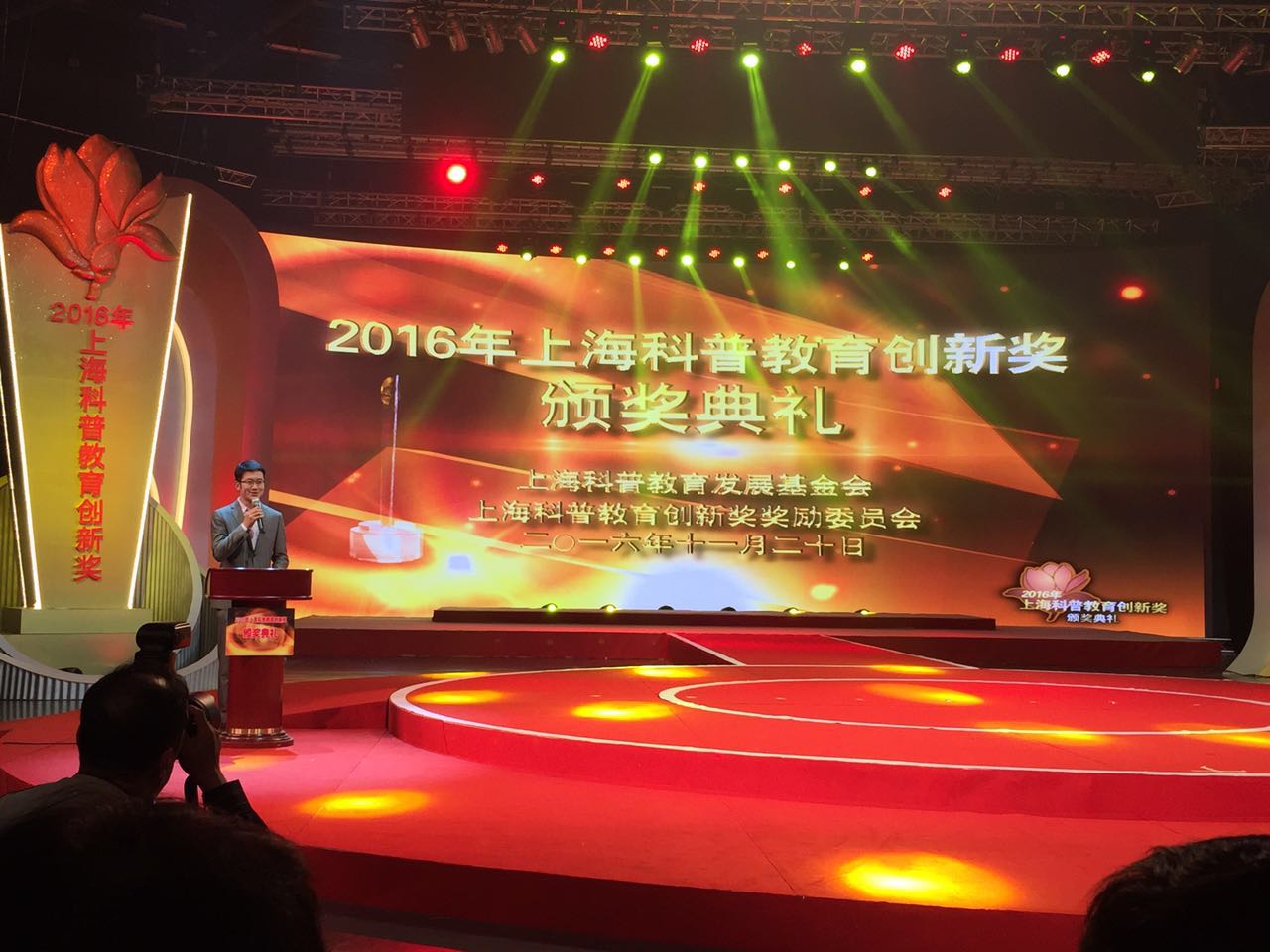 2016年上海科普教育创新奖颁奖典礼于11月20日下午在上海儿童艺术剧场隆重举行,表彰为上海市科普事业做出突出贡献的个人和组织。今年上海科普教育创新奖共评出含提名奖在内的53个奖项。我区青少年活动中心金田则老师获得“科普管理优秀奖”三等奖。