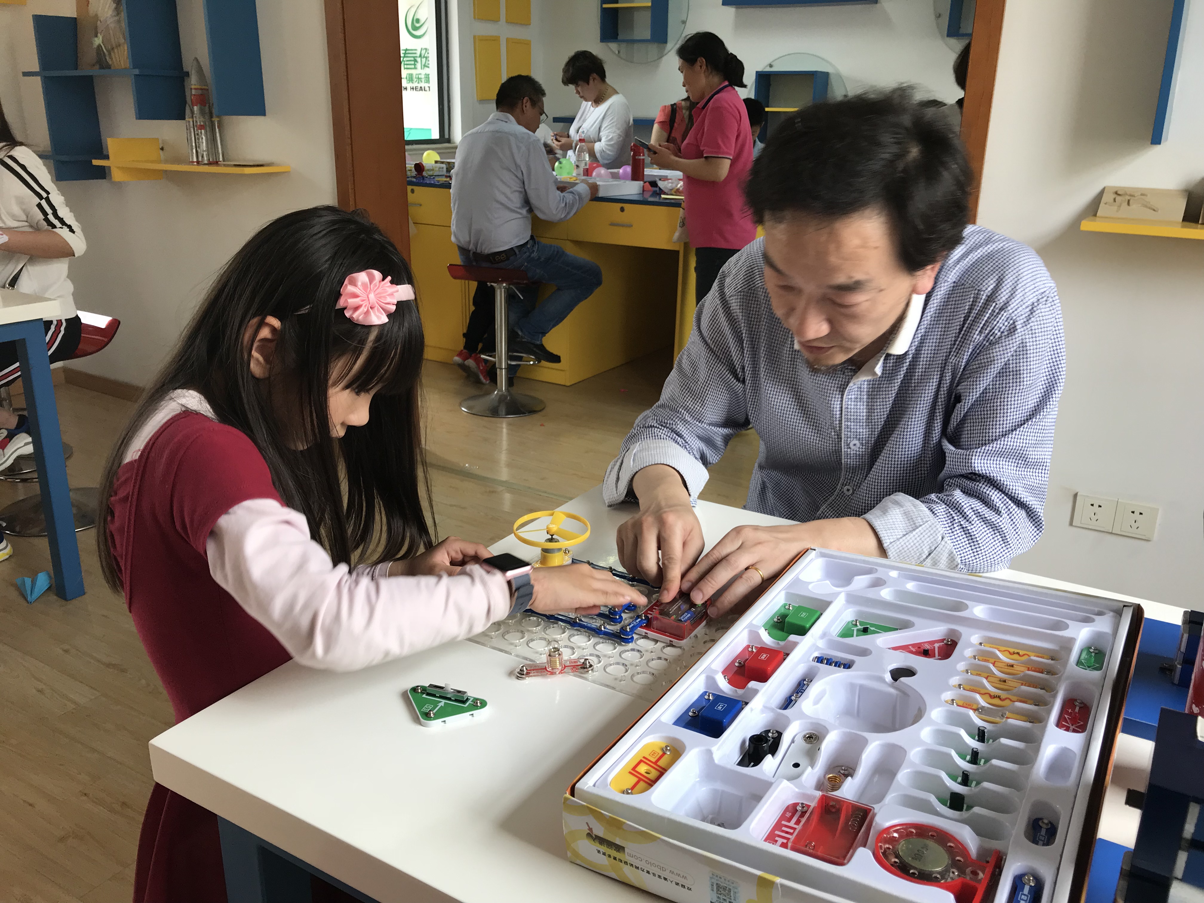 活动现场,指导老师先教小朋友们制作漂亮的玫瑰花送给妈妈,以此表达对“母亲节”的祝福,现场气氛相当的温馨。随后,老师通过电与生活、摩擦起电、简单电路、安全用电等知识点模块,逐一向小朋友们讲解,如:生活中的用电设备有哪些?认识电池的正负极;导体和绝缘体的区分;安全用电小常识;节约用电小常识等。值得一提,现场的实验游戏环节特别受孩子们欢迎,通过让孩子们自己扮演开关、灯泡、电池的角色,并执行老师的口令,让小朋友们很形象地了解了断路、通路、短路现象。最后孩子们根据老师的指导,尝试拼装了单灯泡电路、双灯泡电路、更棒的孩子结合教学套材还拼装了飞碟电路、生日祝福乐趣电路等等。