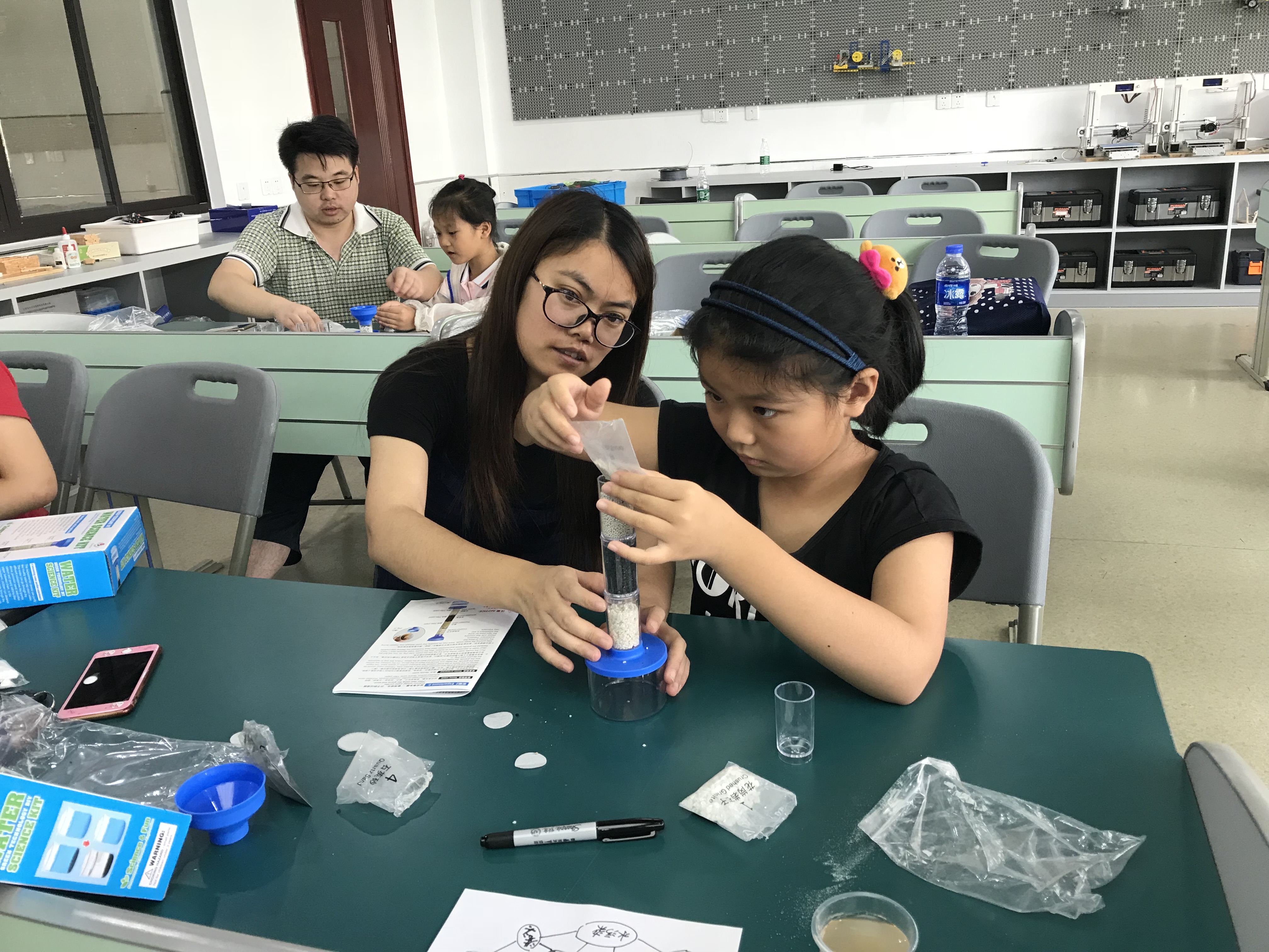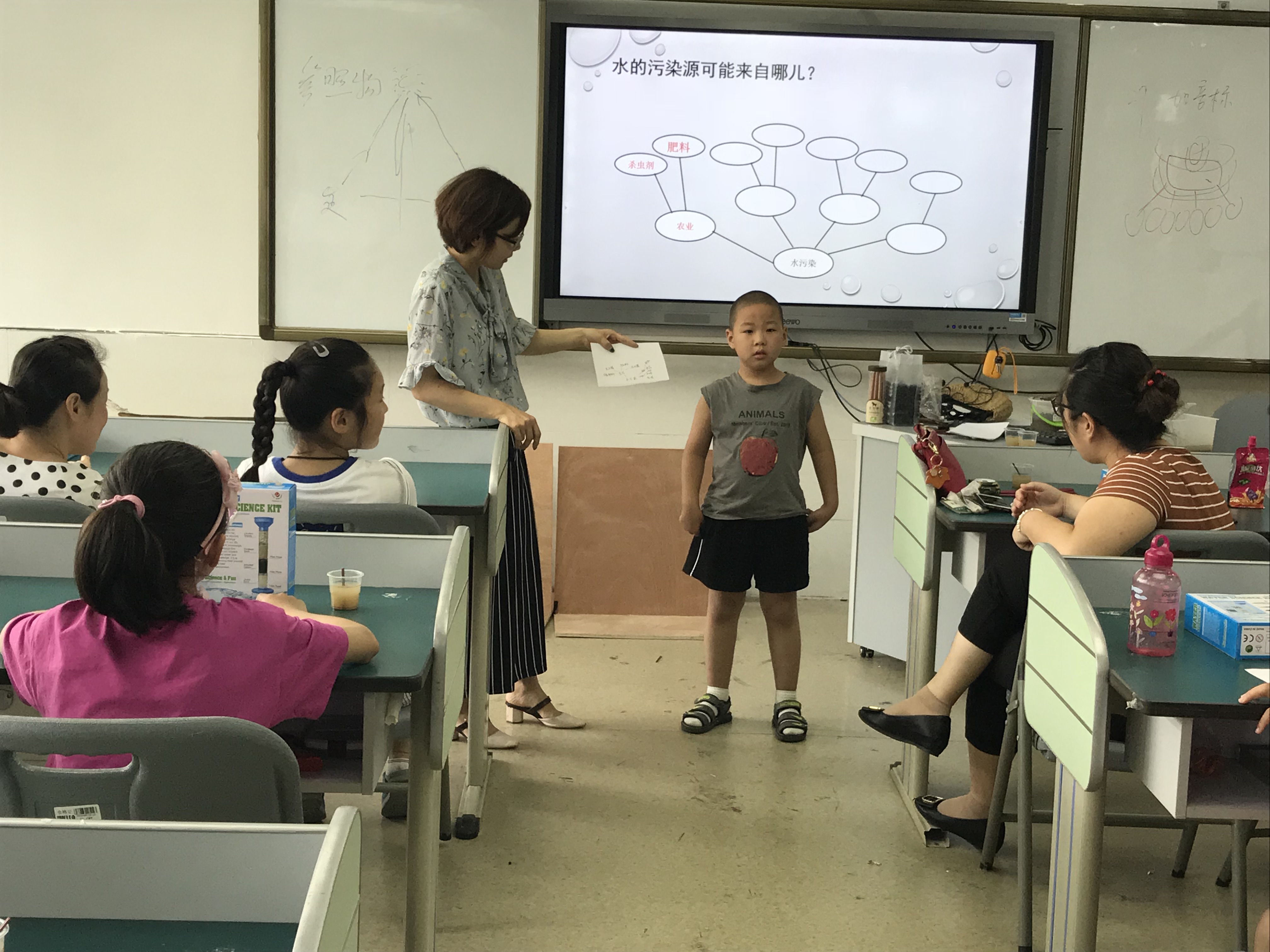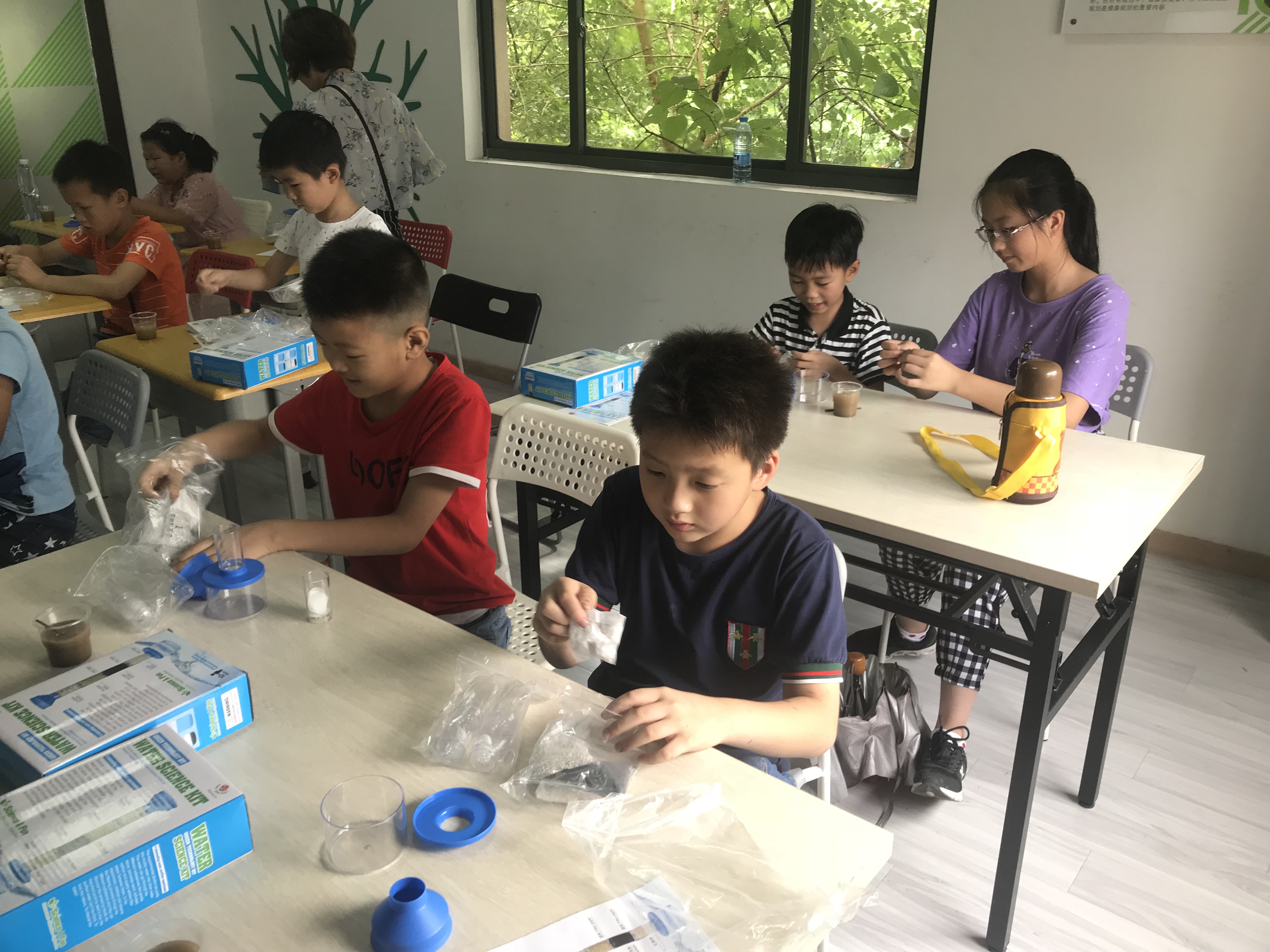 “有趣的污水净化”科学实验课程分五个内容展开。第一,老师先安排小朋友观看了科普视频和图片,让大家初步了解水是生命之源。第二,老师讲解了生活污水、工业污水、石油污染给人类和其他生物所造成的危害性。第三,老师让小朋友动动小手和开动大脑,一起制作思维导图,污水从哪里来,污水“污”在哪里?第四,老师解密污水净化原理,介绍了污水净化器中花岗岩石子、瓷沙、活性炭、石英砂不同材料的作用。第五,污水净化实验操作,小朋友们根据老师指导的搭建步骤,都顺利完成了一套简易的污水净化器。随后,污水净化器通过污水导入,小朋友们都仔细观察到了污水是如何变成净水的实验过程。此外,老师还和大家分享了其他净水实验的方法,并布置了课后练习,让大家回去再动动手。
