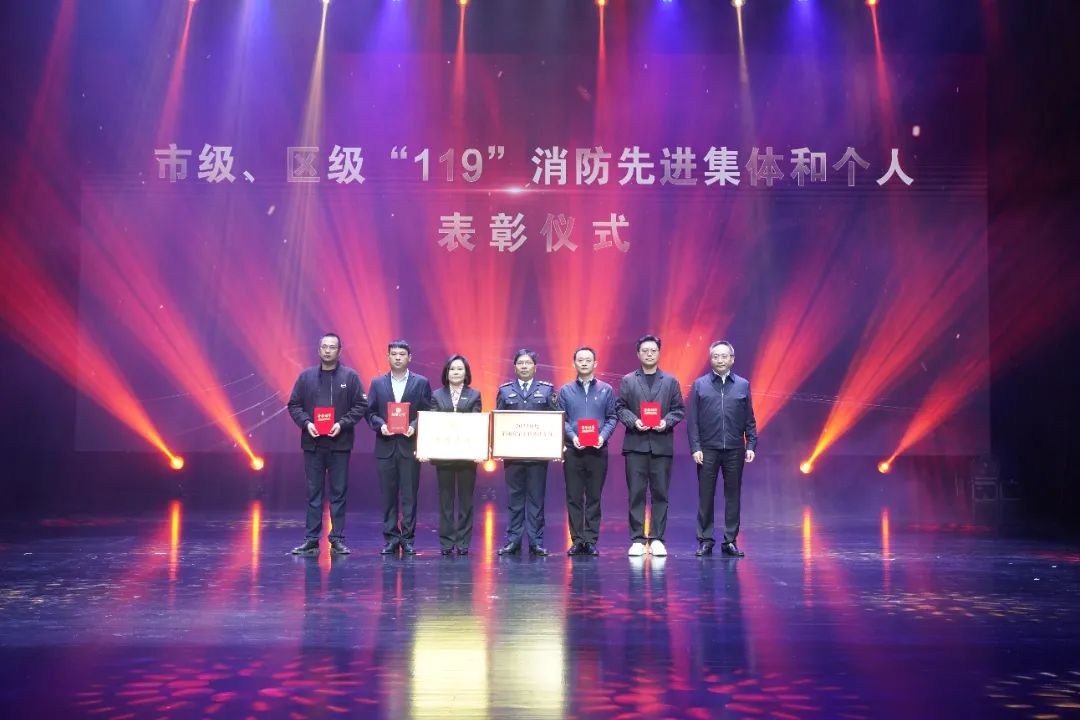 区人大常委会主任张培荣为市级、区级“119”消防先进集体和个人代表颁奖。