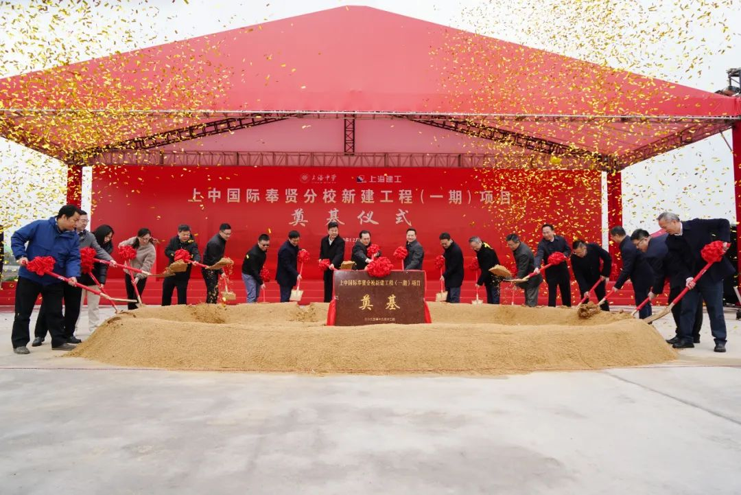 12月12日上午,上中国际奉贤分校新建工程(一期)奠基仪式举行。市教卫工作党委书记沈炜、区委书记袁泉,区委副书记、区长王益群,区人大常委会主任张培荣、区政协主席陈勇章、上海建工集团总裁叶卫东、上海中学校长冯志刚、区委副书记唐晓腾等共同为项目培土奠基。