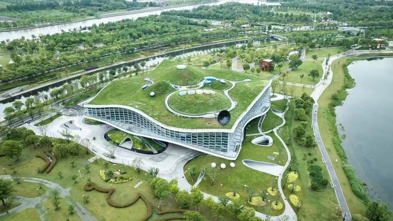 “在水一方”科幻馆坐落于上海之鱼东南角,毗邻奉贤博物馆和多个网红打卡点,靠近地铁5号线金海湖站,占地面积1.68万平方米,总建筑面积近3万平方米。从空中俯瞰,“在水一方”宛如一件悬浮于湖面之上的艺术品。80米见方的壳体结构设计不仅创造了科幻馆开阔的内部空间,还赋予了建筑独特的外观形态。目前,科幻馆已获得“最大的双壳体结构科幻馆”这一大世界基尼斯纪录。