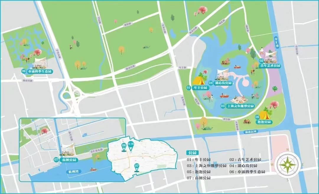 目前,奉贤首批有7座城市公园可供游客搭帐篷游玩。上海之鱼城市公园内有年丰公园、青年艺术公园、雕塑公园、湖心岛公园、泡泡公园,另外还有奉浦四季生态园和南闸公园。