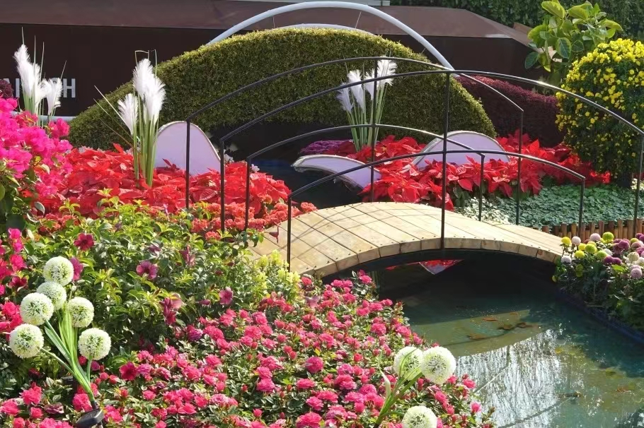 本次的“创园”主题小景利用花架、LED灯牌、景观摆件、造型摆件点亮公园入口处广场,总面积约60㎡。中间设置有一条水流,小桥流水的灵动,留出园路,增加互动、探索的游园特性。植物选用三角梅、丽格海棠、小丰花月季、圣诞花等十多个品种,以带状、丛状、点状自然式组合,展现了植物自然组合的群体美,增加趣味性。