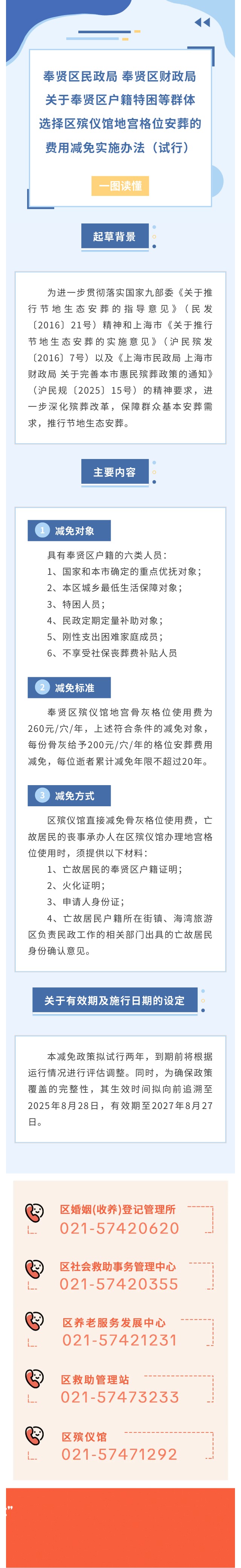 上海市奉贤区民政局 上海市奉贤区财政局关于奉贤区户籍特困等群体选择区殡仪馆地宫格位安葬的费用减免实施办法(试行)的图文解读