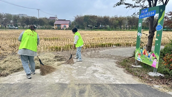 志愿者们对村内两座桥梁及道路两侧展开“地毯式”清理。针对秋季稻草收割后残留的秸秆、落叶堆积问题,采用“人工清扫 + 集中转运”的方式,把散落物归拢打包后放置到垃圾车上;对桥墩缝隙、绿化带边缘等隐蔽位置的塑料瓶、包装袋等垃圾,进行细致捡拾。