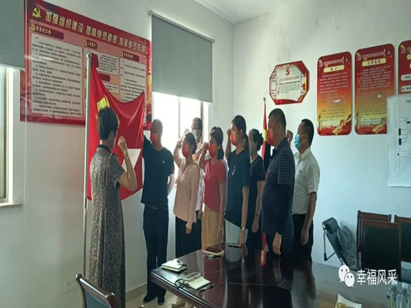 在幸福村党总支书记张海英的带领下,党员重温入党誓词,传承红色基因,坚守初心使命。