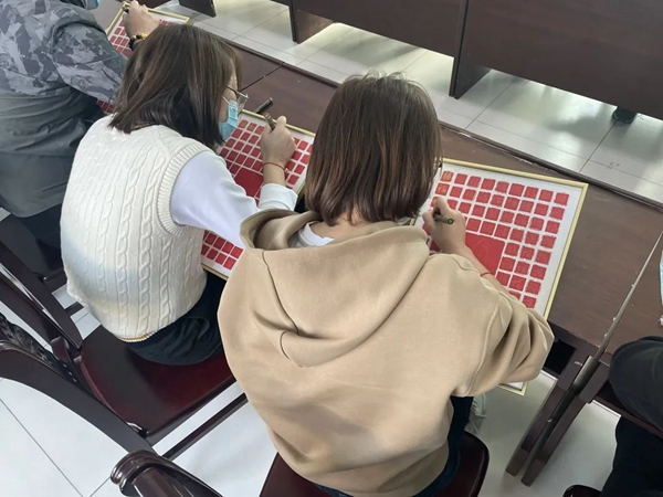在场的各位用心描绘着百福字帖,烫金色的笔记勾绘的是对家人身体安康的祈福、是疫情中人民对国泰民安的美好愿景、更是五千年的中华民族文化的赓续。