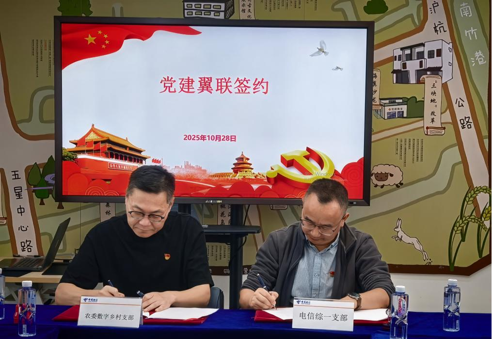 数字乡村服务中心党支部与奉贤电信局分公司综合第一党支部进行了党建翼联结对仪式。此次党建翼联活动旨在原有沟通合作的基础上深化探索新的合作发展模式,以党建作为引领,进一步增加双方全面合作,数字赋能乡村振兴。
