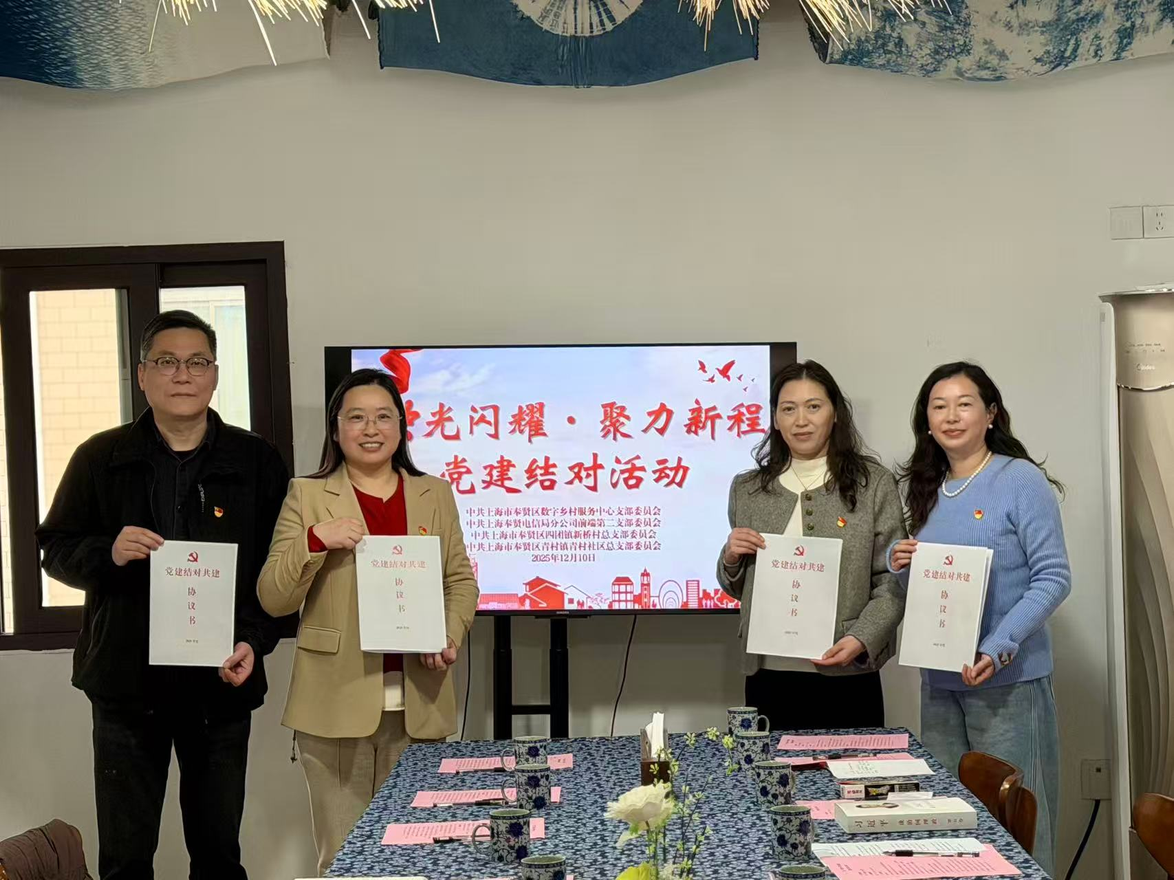 为深入贯彻落实党的创新理论,强化党建引领基层治理效能,搭建跨单位协同合作平台,12月10日下午,区数字乡村服务中心党支部联合青村镇青村社区党总支、四团镇新桥村党总支部、奉贤电信局分公司前端第二党支部,开展“‘融’光闪耀·聚力新程”党建联建活动。