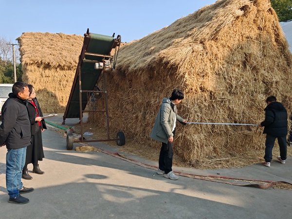 为确保秸秆综合利用申报数据真实可靠、科学规范,核查组采用"台账审查+实地核验+技术指导"三位一体工作模式,精准发力提升监管实效。在秸秆还田核查方面,核查组抽查秸秆还田地块,细致核实作业面积、还田深度等关键指标,指导农机手规范操作。在秸秆离田利用核查环节,核查组对各企业的秸秆收储运台账、利用去向记录等资料进行全面细致审查,逐一核对数据完整性与逻辑性,指导企业补齐缺失材料、规范台账管理。同时,核查组深入田间地头开展实地踏田核查,通过随机抽样方式对企业收购的秸秆进行称重估算,精准核验实际利用量;针对大球盖菇种植等秸秆离田利用场景,现场测量秸秆堆高、堆宽、堆间距、菌间距等关键参数,核实菌种来源与规格,结合种植实际提供技术优化建议,助力提升种植效益。