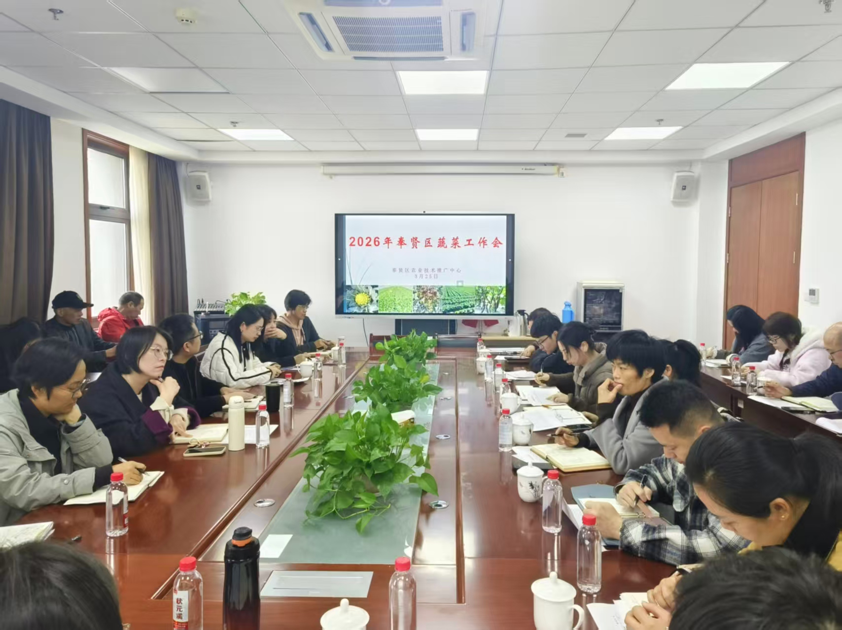 3月25日,区农技中心召开了2026年奉贤区蔬菜生产工作会议。会议由农技中心党总支委员、副主任吴珏主持。各街镇、开发区农业管理部门分管领导、蔬菜专管员及农技中心蔬菜科全体成员参会。
