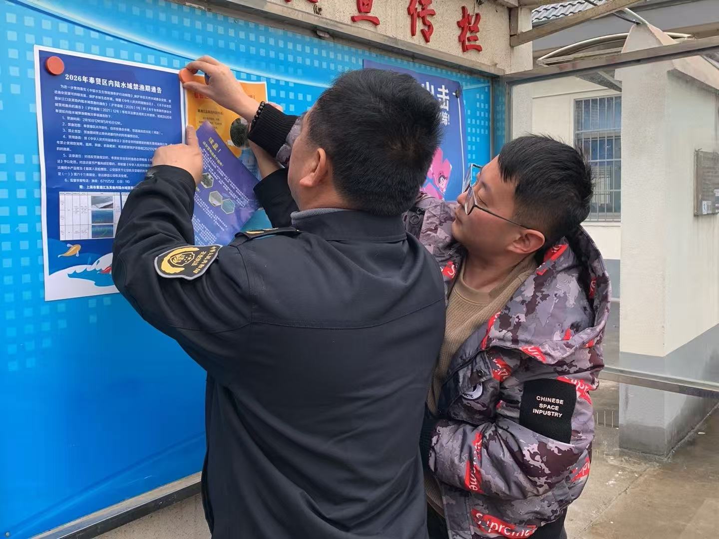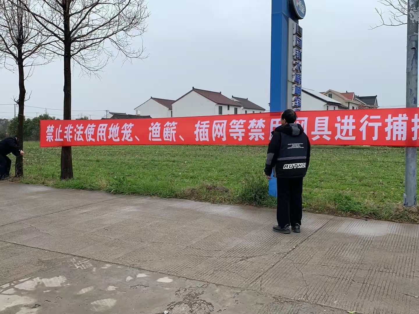 执法人员与村委工作人员在两镇的沿河周边挂起“禁渔护生态,休养生息,利在千秋”等横幅,并在村委公告栏张贴“禁渔期告知书”等宣传资料。同时向现场村民讲解禁渔时间范围及违规后果。通过村委会公告栏张贴、河边现场宣讲等方式,向群众宣传禁渔政策。