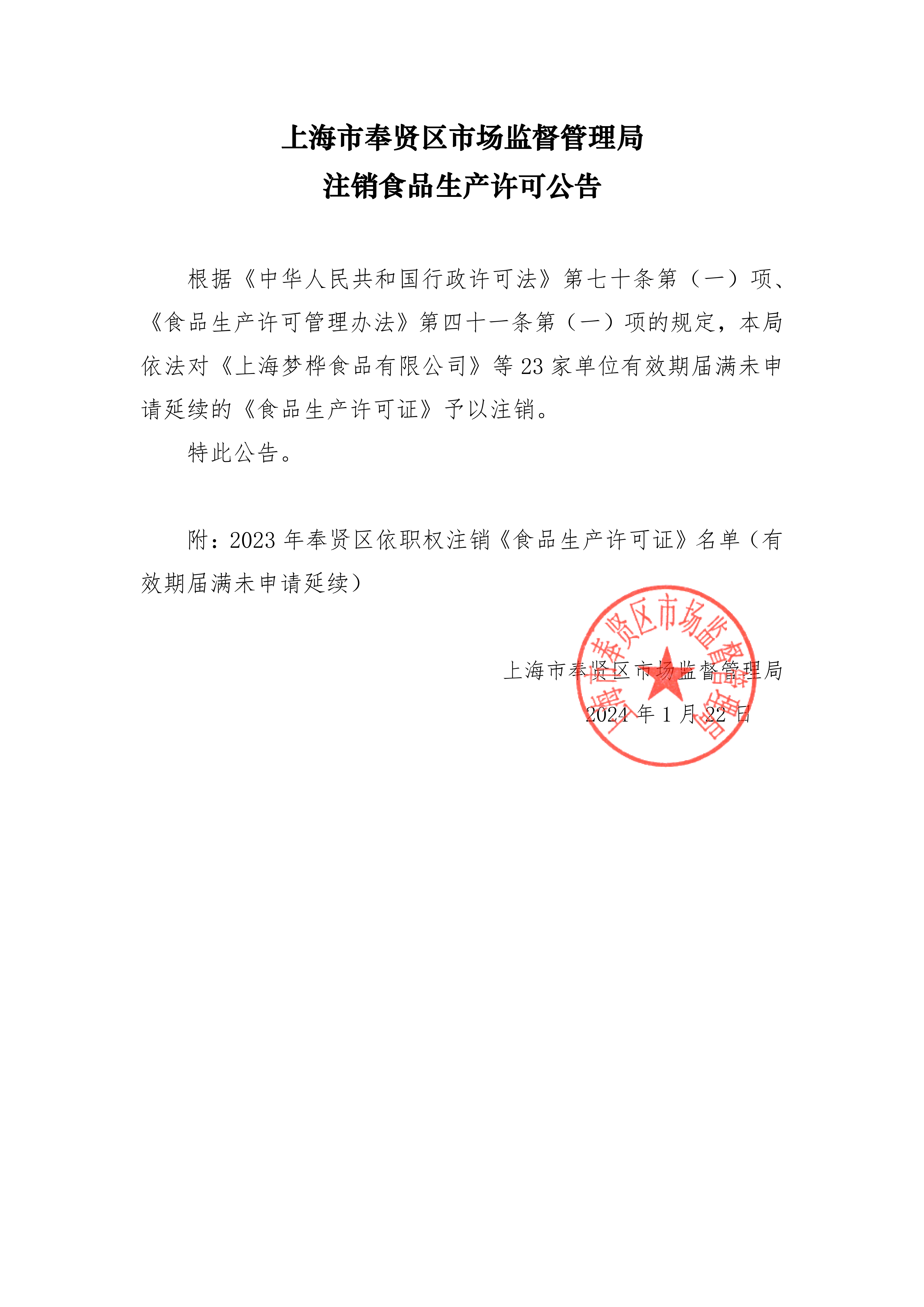 上海市奉贤区市场监督管理局 注销食品生产许可公告