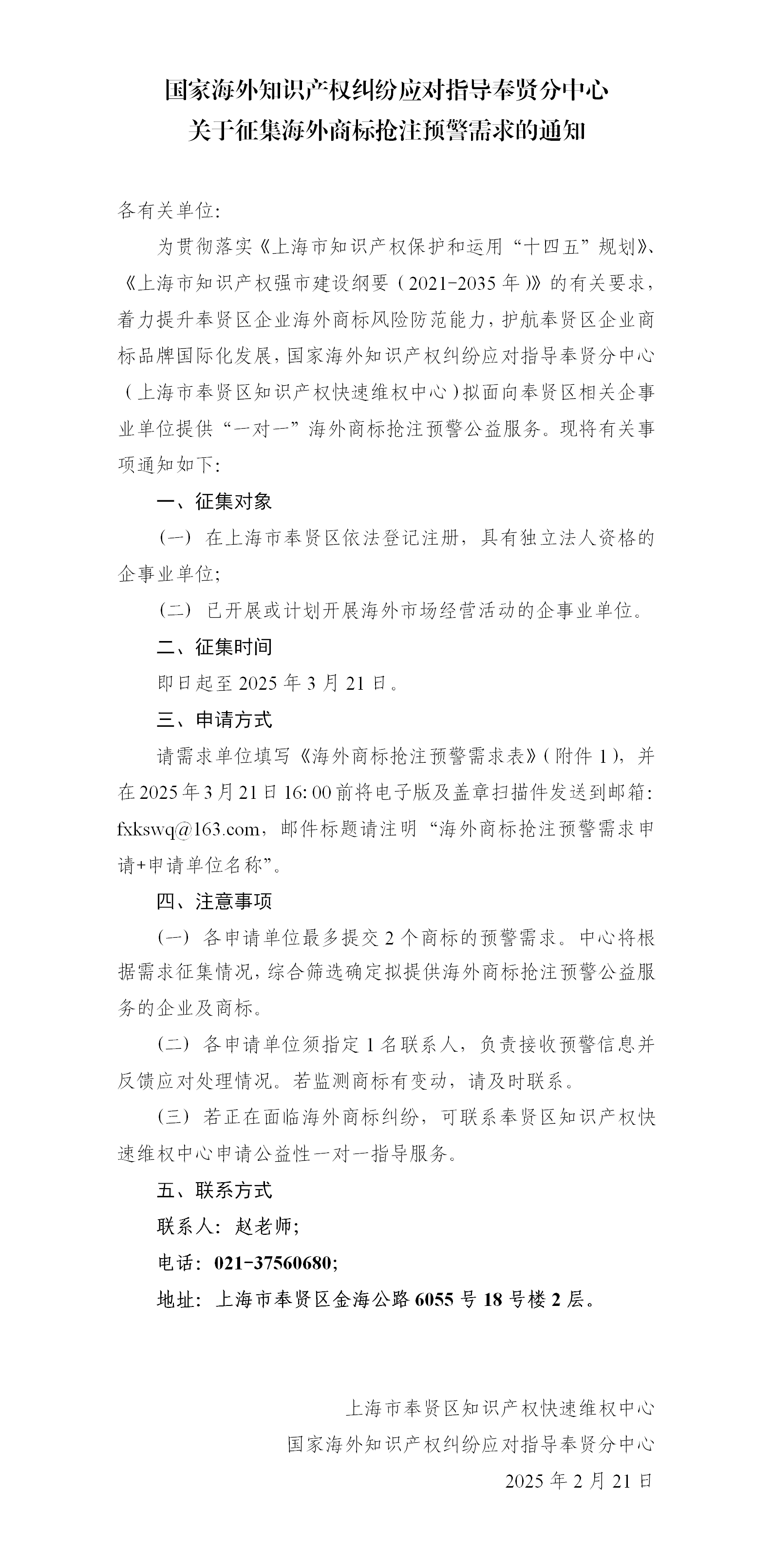 国家海外知识产权纠纷应对指导奉贤分中心关于征集海外商标抢注预警需求的通知