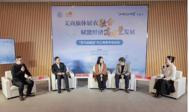 活动中,同济大学建筑与城市规划学院教授、法国建筑科学院外籍院士邵甬;上海大学文学院院长、教授刘旭光;上海社会科学院研究员邓智团;上海奉贤冷江雨巷经济发展有限公司副总经理谈志燕聚焦“文商旅体展农融合 赋能经济高质量发展”开展交流探讨。