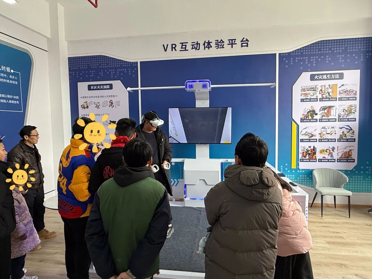 随后,一行人移步到VR体验区。火灾逃生模拟区里,孩子们戴着特制设备,在虚拟场景中模拟火灾逃生全过程,紧张又认真地跟着指引完成每一个动作。
